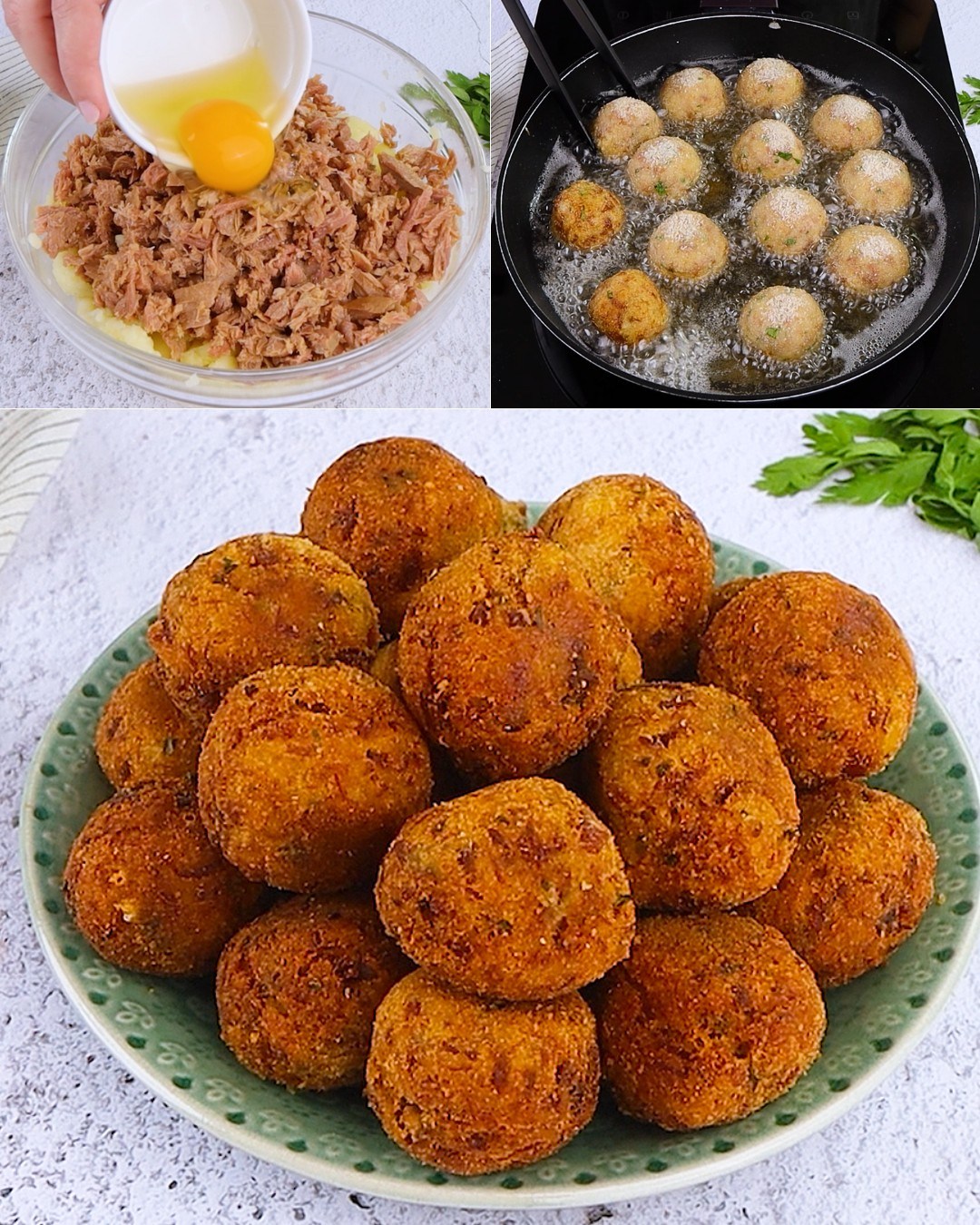INGRÉDIENTS 550g de pommes de terre bouillies 350g de thon à l’huile 1 oeuf 40 g (1/2 tasse) de parmesan Persil Sel 100 g (3/4 tasse) de chapelure huile de friture MÉTHODE