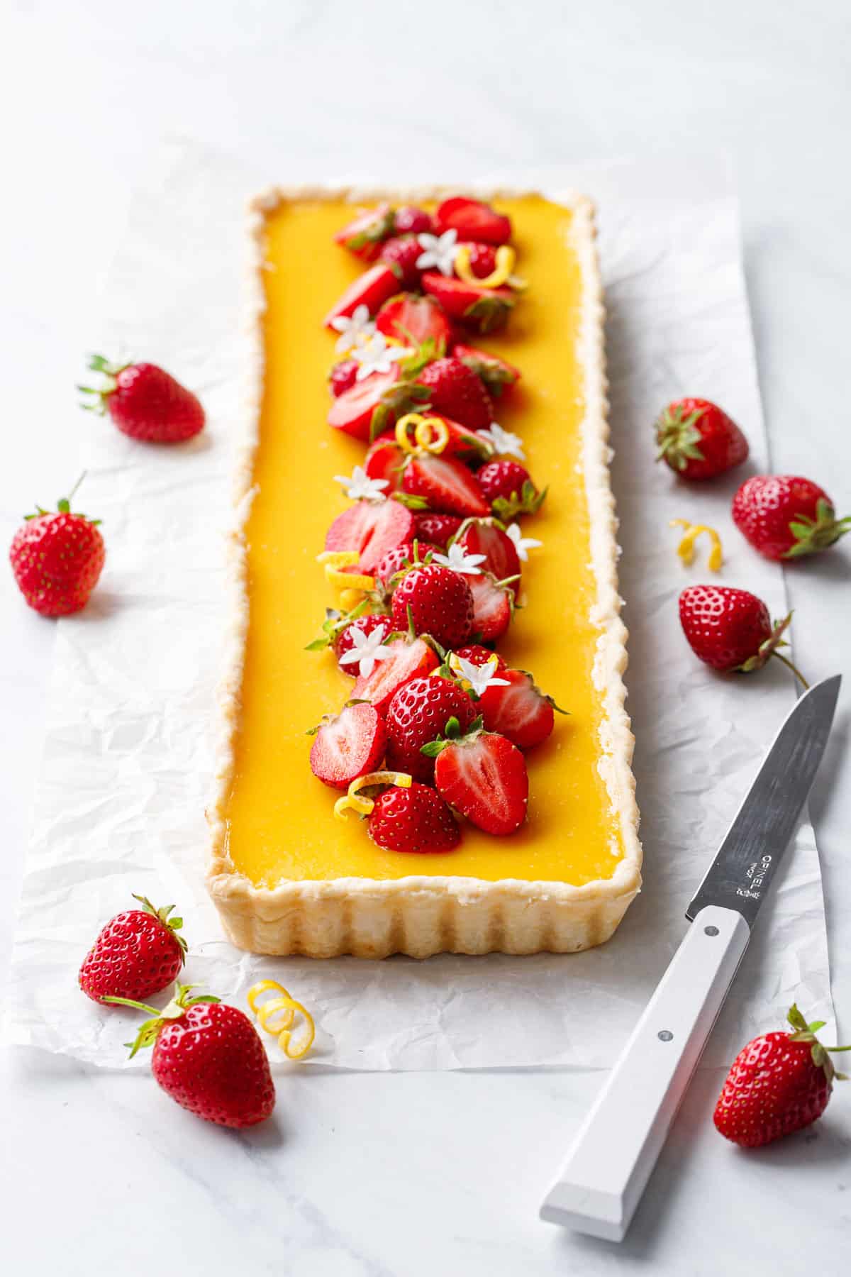 Tarte rectangulaire aux fraises et au citron Meyer garnie de fraises fraîches, de torsades de citron et de fleurs comestibles.