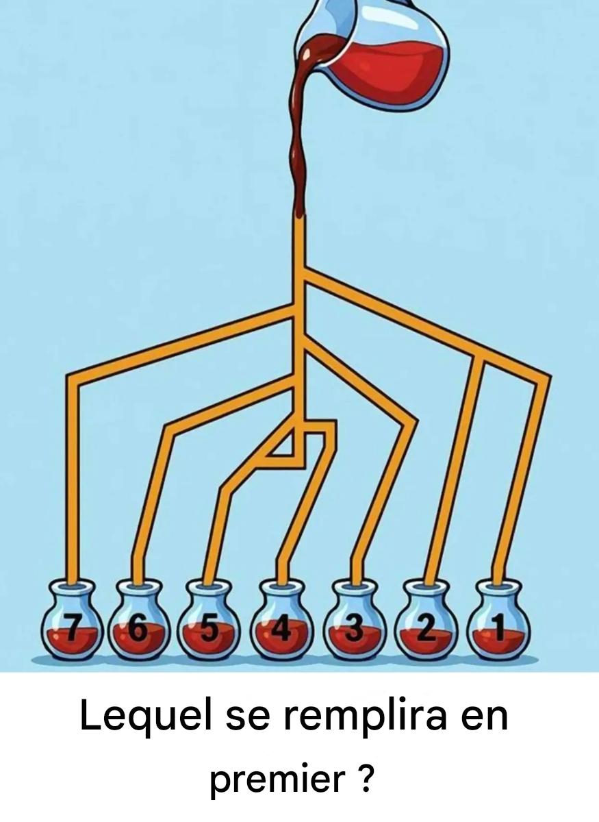 Un robinet, des tuyaux, sept récipients… C’est une question apparemment simple : lequel fait le plein en premier ? Ce type d’énigme est populaire car il nécessite moins de calcul qu’une observation minutieuse. La clé ici est de résister à la tentation de suivre votre instinct et de suivre le chemin de l’eau, comme si vous étiez une goutte sur le point de tomber dans le circuit.